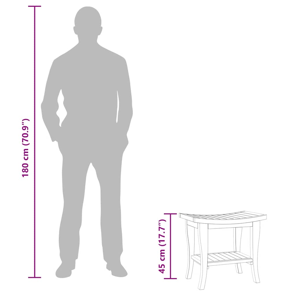 This wooden bathroom side table is a perfect choice for holding towels and bath accessories in the shower. Solid teak wood: Solid teak wood is a beautiful natural material. It has been seasoned, kiln dried and then treated with a rustic finish. Teak wood is known for its exceptional strength and weather resistance.Storage shelf: The teak side table holds up to 10 kg, ideal for storing your bath essentials such as bath towels, soap, shampoos, lotions, body wash, or scented candles, all these shower necessities are within easy reach. It is not suitable for sitting at all.Easy-to-clean surface: The smooth surface makes the bathroom accent table easy to clean with a damp cloth.