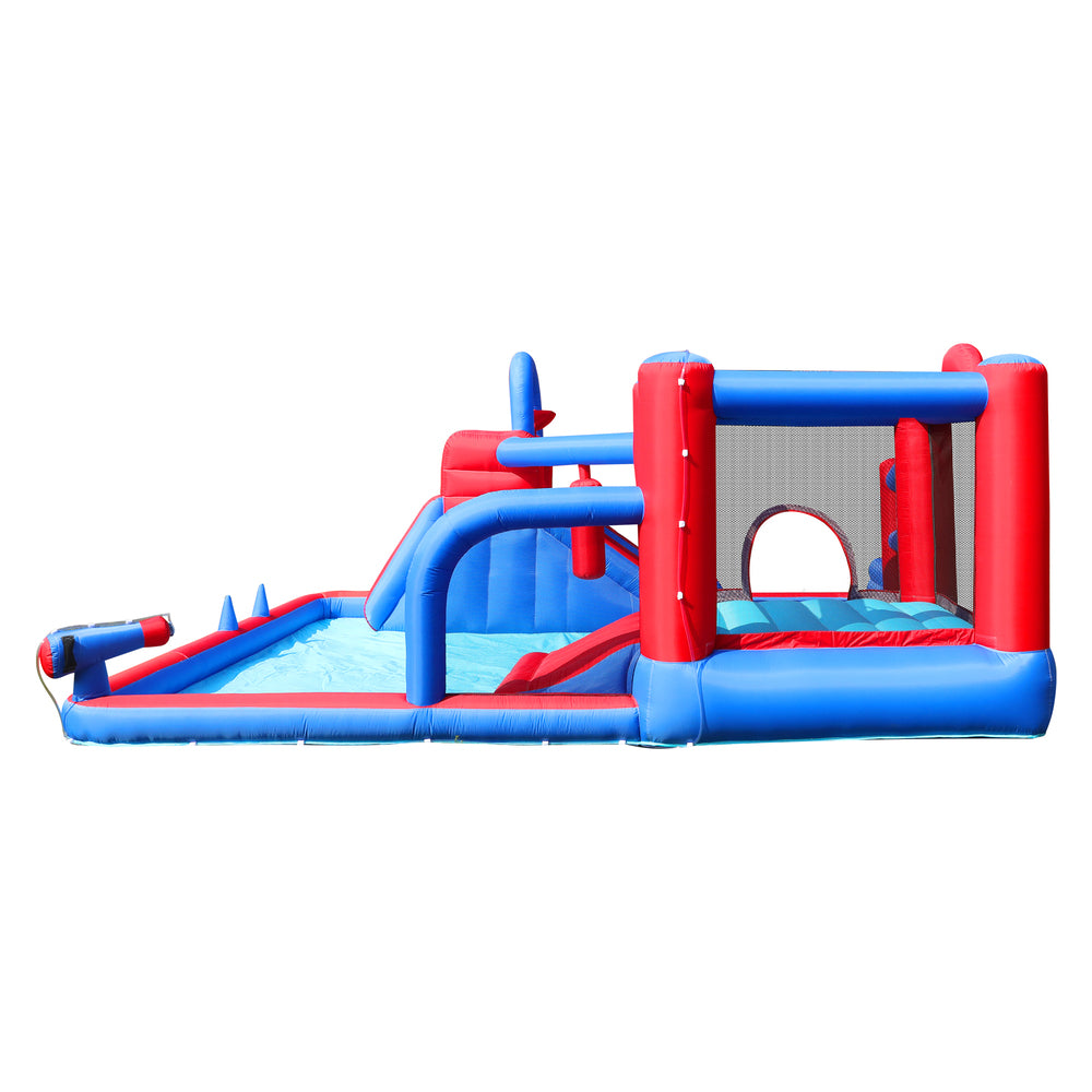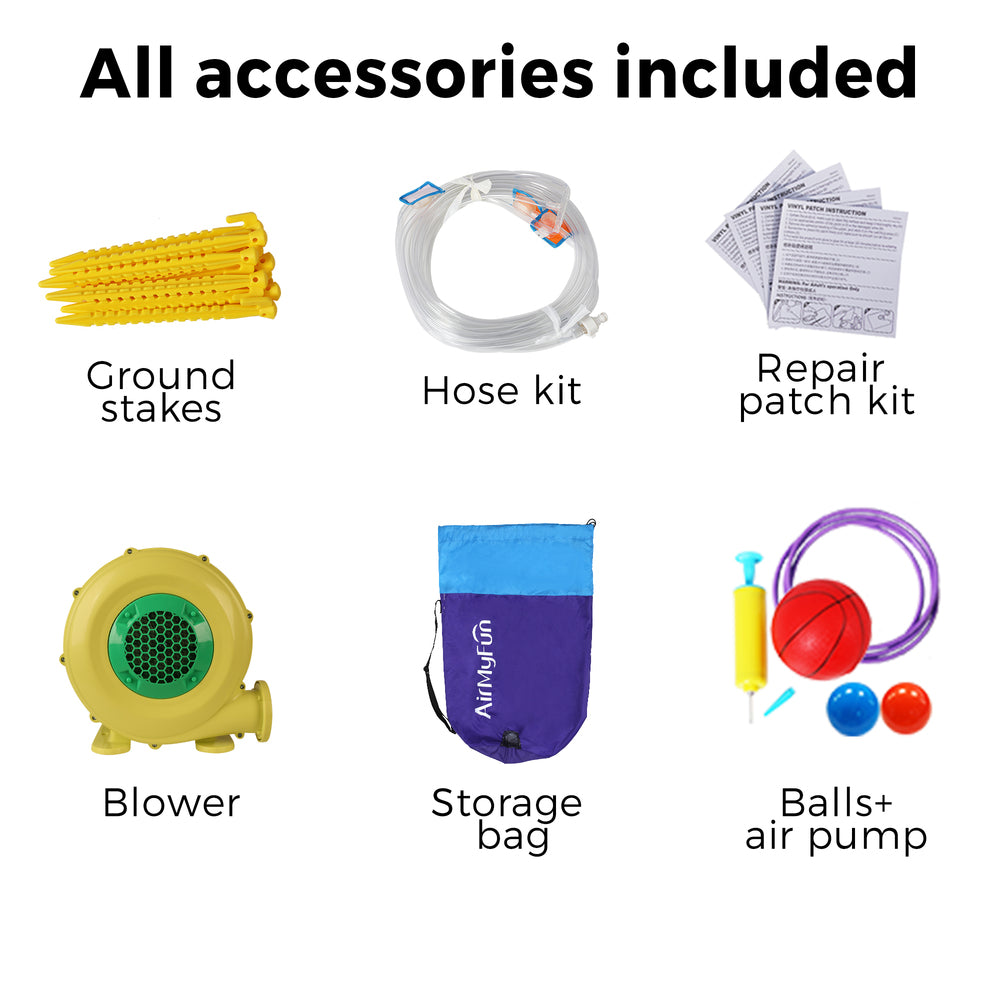 11 play zones: Ball pit, trampoline jump, water slide, punch bag, climb, sprinkler, water gun, water bowl, basketball hoop, hoop rings, throwing ball