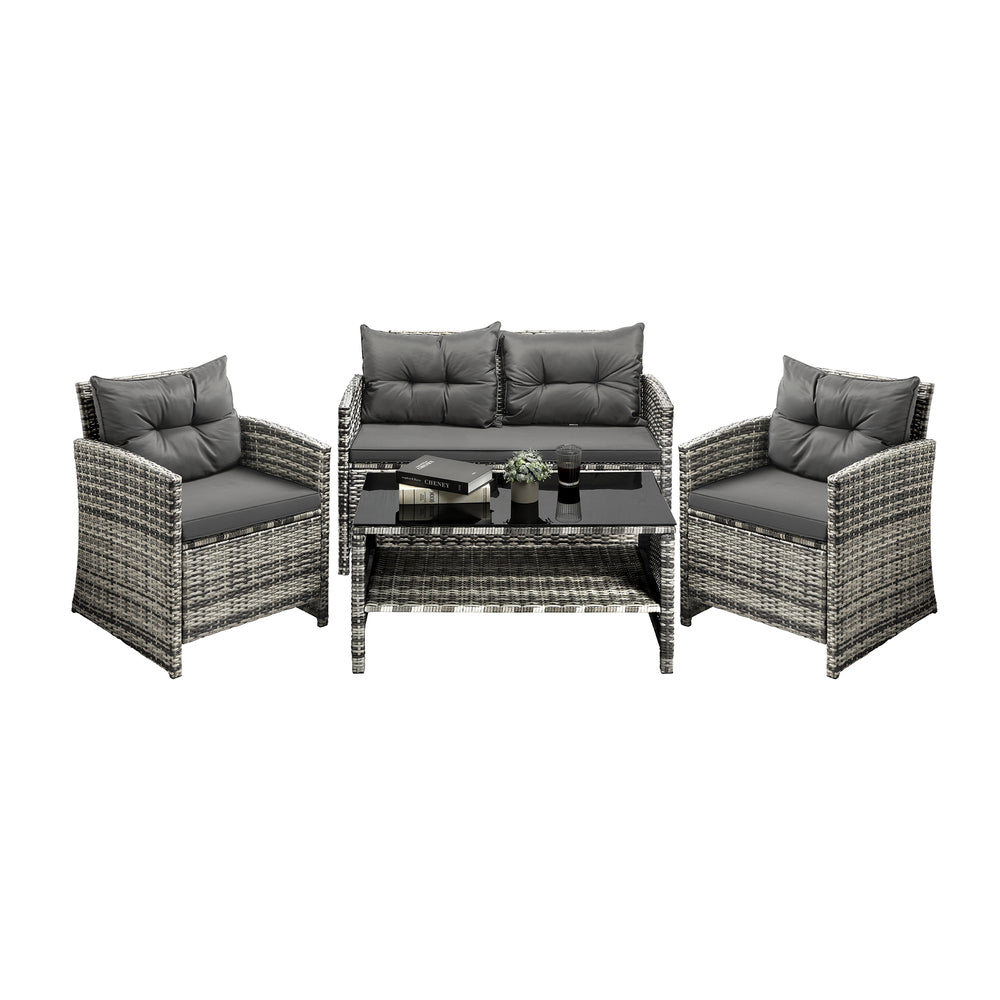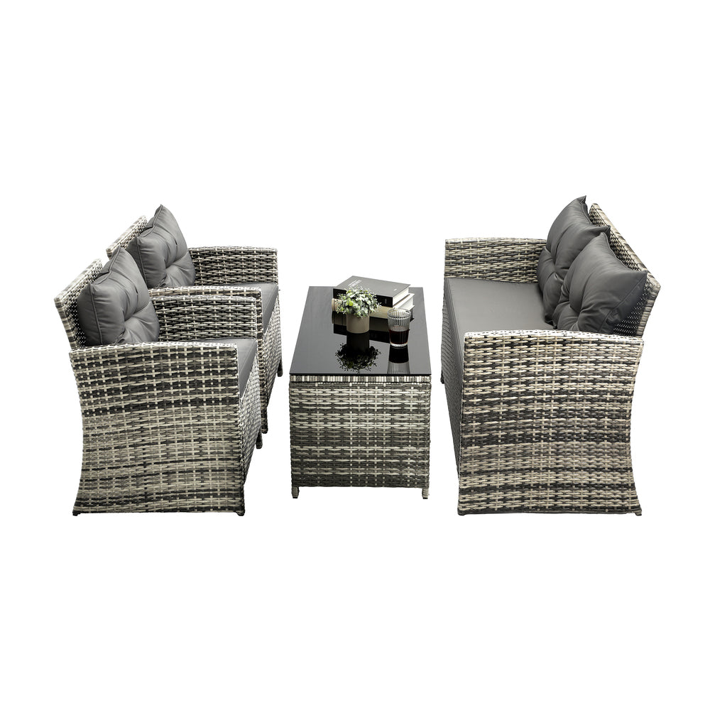 Comprising two single armchairs, a 2-seater sofa, and a matching coffee table, the Livsip 4-pc Outdoor Patio Rattan Set brings a cool finesse to your home, outdoors or indoors. Own a set today.