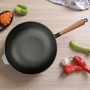 31cm Cast Iron Round Bottom Wok Skillet Preseasoned Wood Handle Black