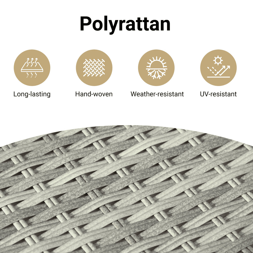 This 2-in-1 garden bench, serving as both an outdoor loveseat and sofa bed, makes a practical and eye-catching addition to your outdoor living space. Durable material: PE rattan, also known as poly rattan, is a strong, low-maintenance synthetic material that looks like natural rattan. It's lightweight, easy to clean, and commonly used for outdoor furniture due to its durability and weather-resistant properties.Adjustable backrest: This garden seat has handles. You can adjust the backrest to any position by pulling the handle, and quickly return it to its original position.Versatile functionality: This outdoor furniture can be used as a 2-seater bench or a sofa bed. You can easily switch it to a bed by reclining the backrest and pulling out the stool from under the bench. The support panels behind the backrests make the bed more stable.Convenient side table: This outdoor furniture features foldable side tables with a gas spring on the armrests, providing convenient spots to keep your essentials within easy reach. Good to know:To make sure your outdoor furniture stays beautiful, we recommend protecting it with a waterproof cover.