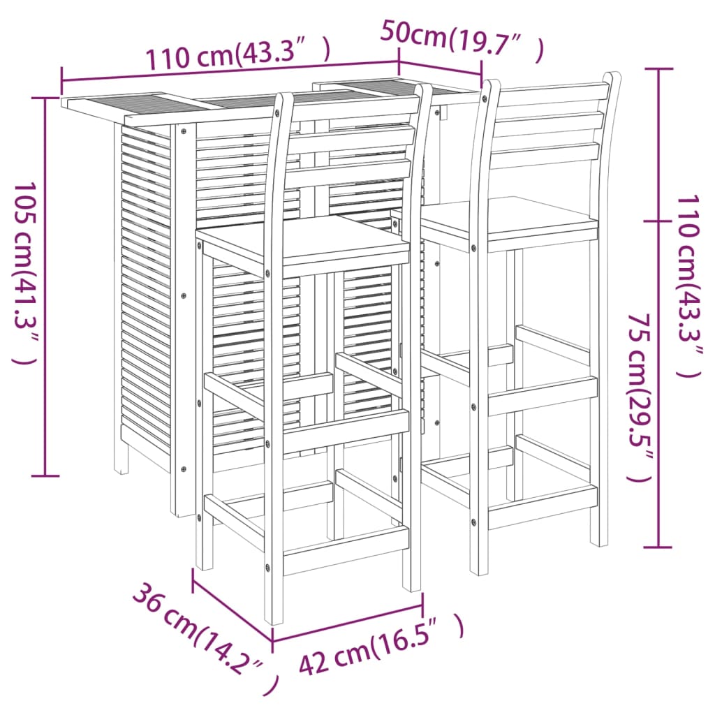 This wooden garden bar set has an elegant design and is meant to be the focal point of your garden, patio, or terrace. Solid acacia wood: Solid acacia wood is a beautiful natural material. Acacia wood is a tropical hardwood, which is dense, sturdy, and durable. Additionally, the oil-finished surface makes it easy to clean the garden table and chairs.Sturdy wooden frame: The wooden frames of the outdoor dining set ensure sturdiness and stability.Practical shelves: The bistro table has 2 shelves for keeping food and drinks within easy reach.Comfortable bar stools: The footrests of these wooden bar stools provide extra seating comfort.Timeless look: The sleek design of the wooden bistro table and stools make them a timeless investment for your home. Note:In order to extend the life of your outdoor furniture, we recommend you to clean it regularly and do not leave it outdoors without protection unnecessarily.Clean: Use a mild soap solution.Storing: If possible, store in a cool, dry place indoors. If the product is stored outdoors, protect it with a waterproof cover. Wipe and dry the excess water or snow from flat surfaces after a rain or snowfall. Allow sufficient air circulation to avoid moisture-related damage.