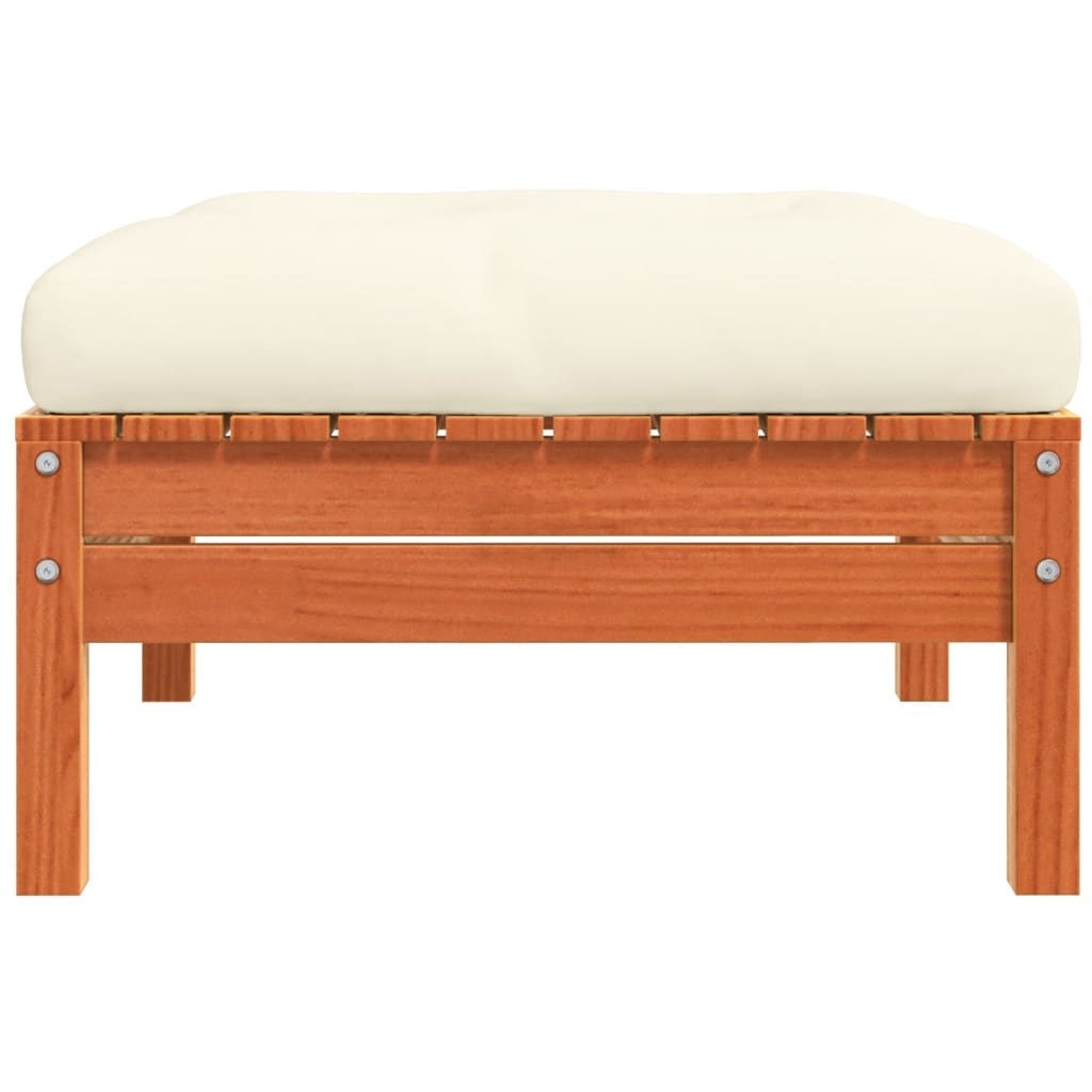 These wooden garden footstools with cushions will make a great addition to your garden, terrace, or patio for chatting with family and friends or just enjoying the weather. Solid pine wood: Solid pine wood is a beautiful natural material. Pine wood has a straight grain, and the knots give the material its signature, rustic look. Made of solid pine wood, this outdoor footstool is durable and stable.Comfortable seat experience: The thickly-padded cushion make the pallet ottoman more comfortable to sit on.Versatile usage: This outdoor ottoman can not only be used to sit or relax your feet, but it can also be used as a coffee table to hold your placed drinks, food, and other decorations.Slatted design: The slatted design of the garden ottoman effectively prevents water from pooling, ensuring that the seat remains dry and free from potential rot.Modular design: This patio ottoman features a modular design, making it completely flexible and easy to move around to suit any setting. You can combine it with other modular segments available in the drop-down menu to create your own personal garden lounge set configurations! Good to know:To make sure your outdoor furniture stays beautiful, we recommend protecting it with a waterproof cover.