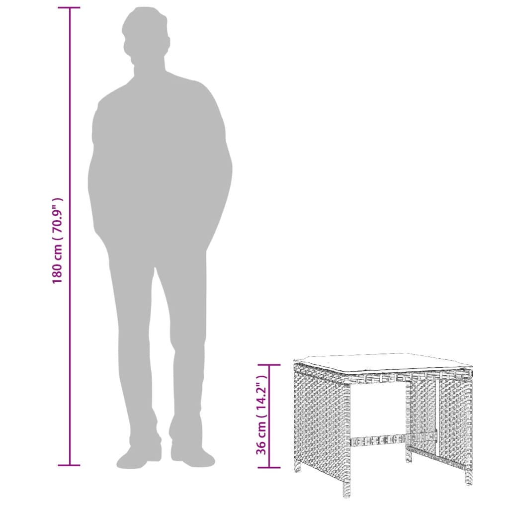 Relax and enjoy the outdoors on these comfortable garden stools! Durable material: PE rattan, also known as poly rattan, is a strong, low-maintenance synthetic material that looks like natural rattan. It's lightweight, easy to clean, and commonly used for outdoor furniture due to its durability and weather-resistant properties.Comfortable seat experience: This outdoor furniture, complete with thickly padded cushions, offers a comfortable seating experience.Removable and washable cover: These seat cushions feature removable covers for easy washing and maintenance. Robust and stable frame: The powder-coated steel frame ensures the garden furniture is strong and stable for daily outdoor use. Good to know:To make sure your outdoor furniture stays beautiful, we recommend protecting it with a waterproof cover.