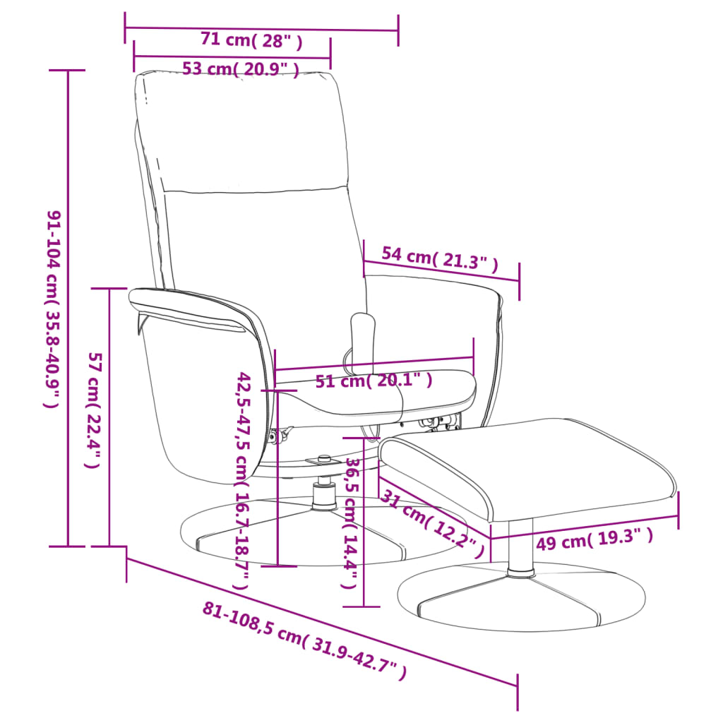 Sit back and drift away in this highly comfortable massage recliner chair! Vibration function: The featured 6 massage points let you experience a better-targeted massage. Additionally, the included hand control allows you to pick different massage programs. The massage function is powered by the USB connector that requires a certified 5V USB power source (not included).Manual reclining function: The massage chair is specially designed with a reclining function so that you can adjust the backrest as per your comfort. The backrest can be tilted from 105 to 125 degrees.360-degree swivel: The massage recliner can be swivelled freely in 360 degrees, giving it extra flexibility.Comfortable seat experience: The thickly padded seat, backrest, and wide armrests covered in faux leather provide a cosy and warm sensation, making you feel embraced while seated. The extra stool is suitable for resting your feet when you lie on the recliner, making this chair a comfortable seat for any occasion.Solid and stable frame: The frame made of plywood and metal provides a strong structure. And the round base firmly grasps the ground, which offers optimal sturdiness and stability. Good to know:To save space, some parts or cushions are packed inside the furniture—check zipped compartments or beneath the seat cover for any hidden components.