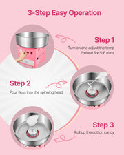 Using this machine couldn't be easier. Turn on the power, adjust the voltage, warm up for 2-3 minutes, and pour sugar into the spinning head, and then you just need to use the sticks to collect the cotton candies from the head. Even for the first time, it's easy to make a perfect cotton candy