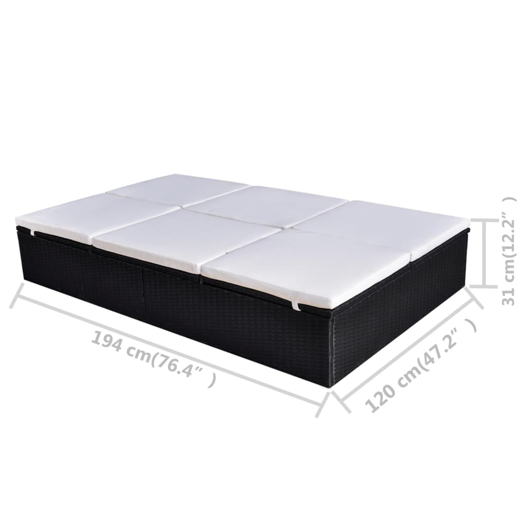 This high-quality 2-person rattan sunlounger combines style and functionality, and will become the focal point of your garden or patio. Thanks to the weather-resistant and waterproof PE rattan, the sunlounger is easy to clean, hard-wearing and suitable for daily use. The sunbed features a sturdy powder-coated steel frame, which is highly durable. Both sides of the lounger can be pulled up and the backrests can be adjusted in four different levels for the most comfortable position. The thick, removable cushions will undoubtedly provide the ultimate seating and lying comfort. The cushion covers can be easily removed and washed. Note: We recommend covering the sun lounger in the rain, snow or frost.