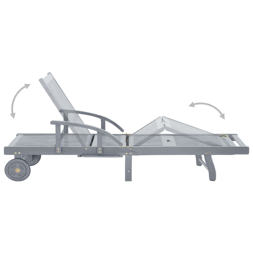 Relax and take a load off in your garden or patio on this comfortable wooden sun lounger! You can spend a relaxing afternoon in your own outdoor space. It is perfect for a pool, balcony, garden, etc. This outdoor sun lounger is made of solid acacia wood with a grey wash finishing, making it sturdy and stable. The backrest and footrest are adjustable, and you can lock the lounger into the desired position. This garden sun lounger can be easily moved around the house with equipped 2 wheels. The sunbed features a convenient pull-out table, to place your phone, sunglasses, drink and other small items. The cushion adds extra comfort for you while lounging. Each cushion features two sets of ropes so that you can fix it on the sun lounger tightly. Note: In order to extend the life of your outdoor furniture, we recommend you to clean it regularly and do not leave it outdoors without protection unnecessarily.Clean: Use a mild soap solutionStoring: If possible, store in a cool, dry place indoors. If the product is stored outdoors, protect it with a waterproof cover. Wipe and dry the excess water or snow from flat surfaces after a rain or snowfall. Allow sufficient air circulation to avoid moisture-related damage.