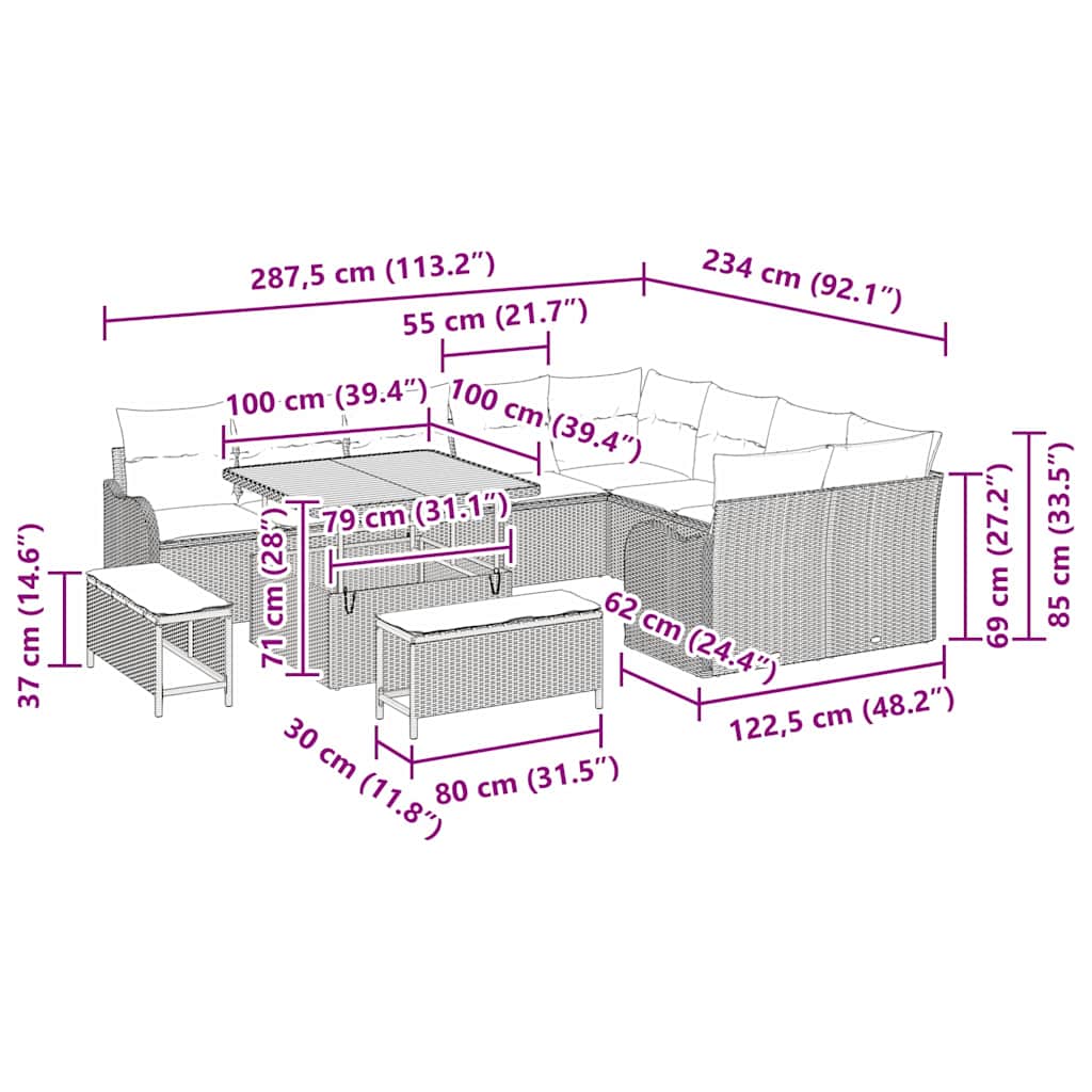 - 2 x Arm sofa, 2 x Corner seat, 5 x Centre seat, 3 x Stool, 1 x Table