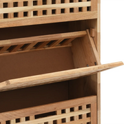 Our wooden shoe storage cabinet, with a stylish lattice design, will not only make a great addition to your interior, but also keep your shoes organised and well ventilated. The shoe cabinet has three storage compartments, which provide ample space for storing nine pairs of shoes. Made of solid walnut wood and plywood, the shoe storage bench is very sturdy and durable. This strong entryway cabinet makes a highly practical place for neatly storing your shoes in style and clutter-free. The cabinet is easy to assemble. WARNING: In order to prevent overturning, this product must be used with the wall attachment device provided