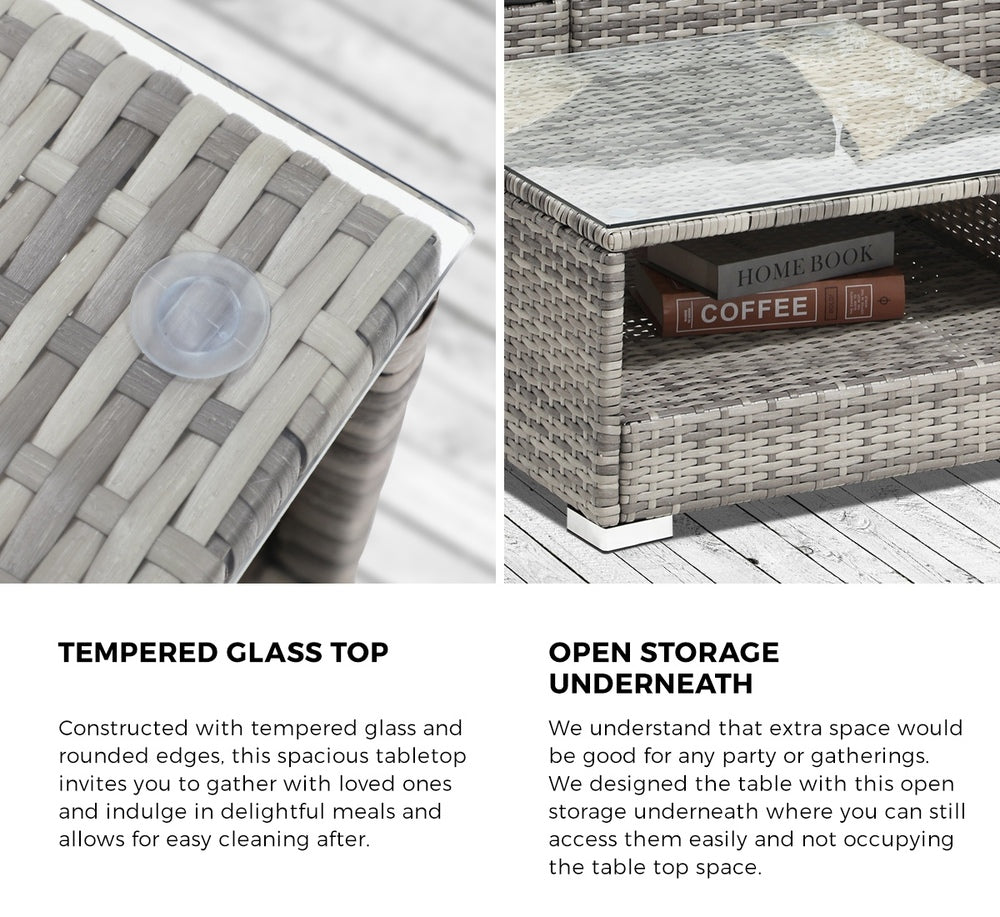 The included coffee table adds both functionality and elegance to the set. With its sleek design and ample surface area, it provides the perfect spot to place drinks, snacks, or even decorative items, adding a touch of sophistication to your outdoor oasis.