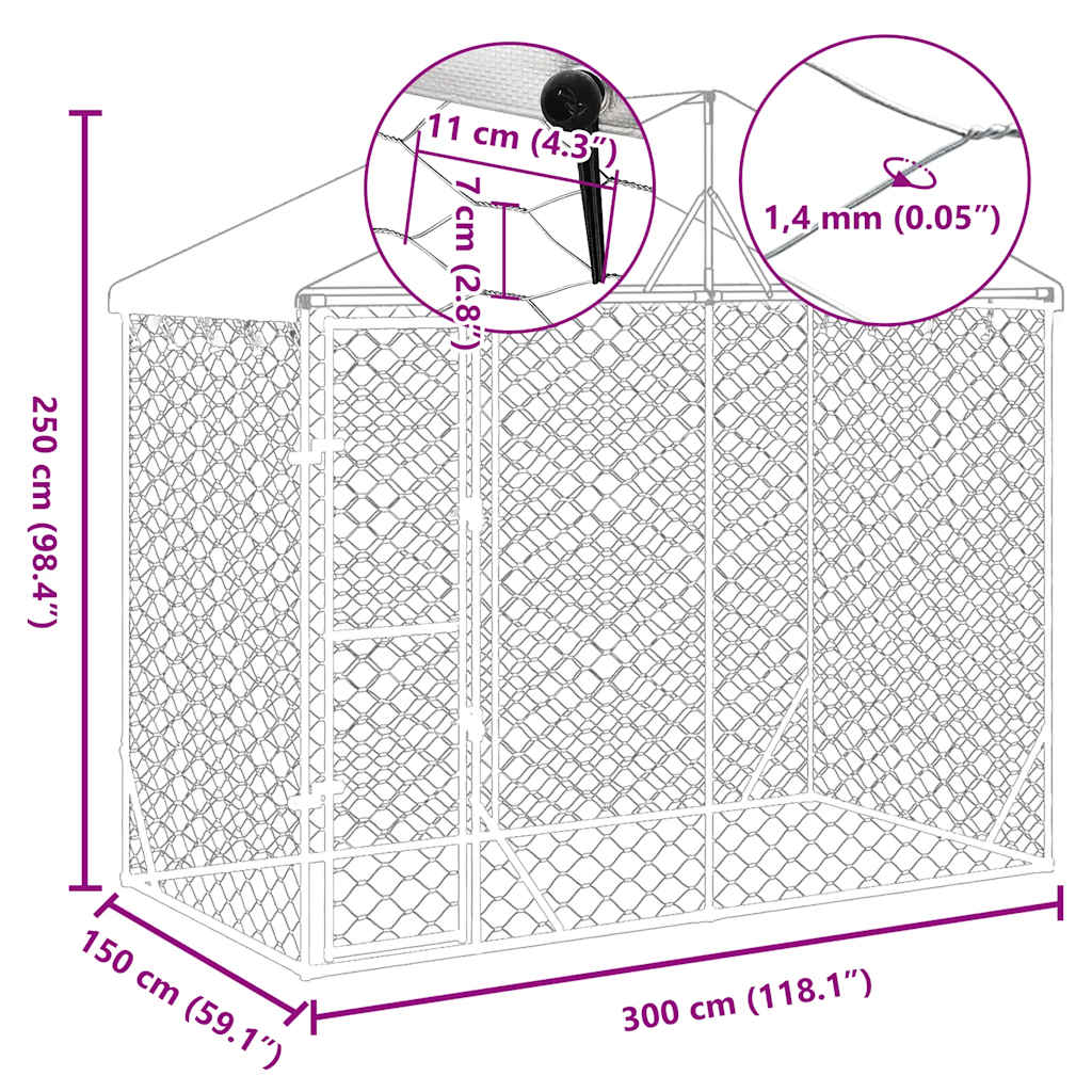 This practical and spacious outdoor dog kennel with a roof is a perfect choice as an outdoor enclosure for keeping your animals safe and comfortable. Versatile kennel: This dog kennel features a spacious space that allows your dogs, chickens, rabbits, ducks, and other small animals to play, exercise, train, or just rest.Sturdy construction: Made of heavy-duty galvanised steel, the dog cage is sturdy and durable.Lockable door: This outside dog kennel has a lockable door to prevent your small animals from predators and other hazards while outdoors.Protective roof: Made of polyethylene, the roof is water-resistant and UV-resistant, providing protection from sun, rain, snow, as well as other weather conditions.Mesh design: The mesh design of the dog run kennel ensures a dry and ventilative living condition.